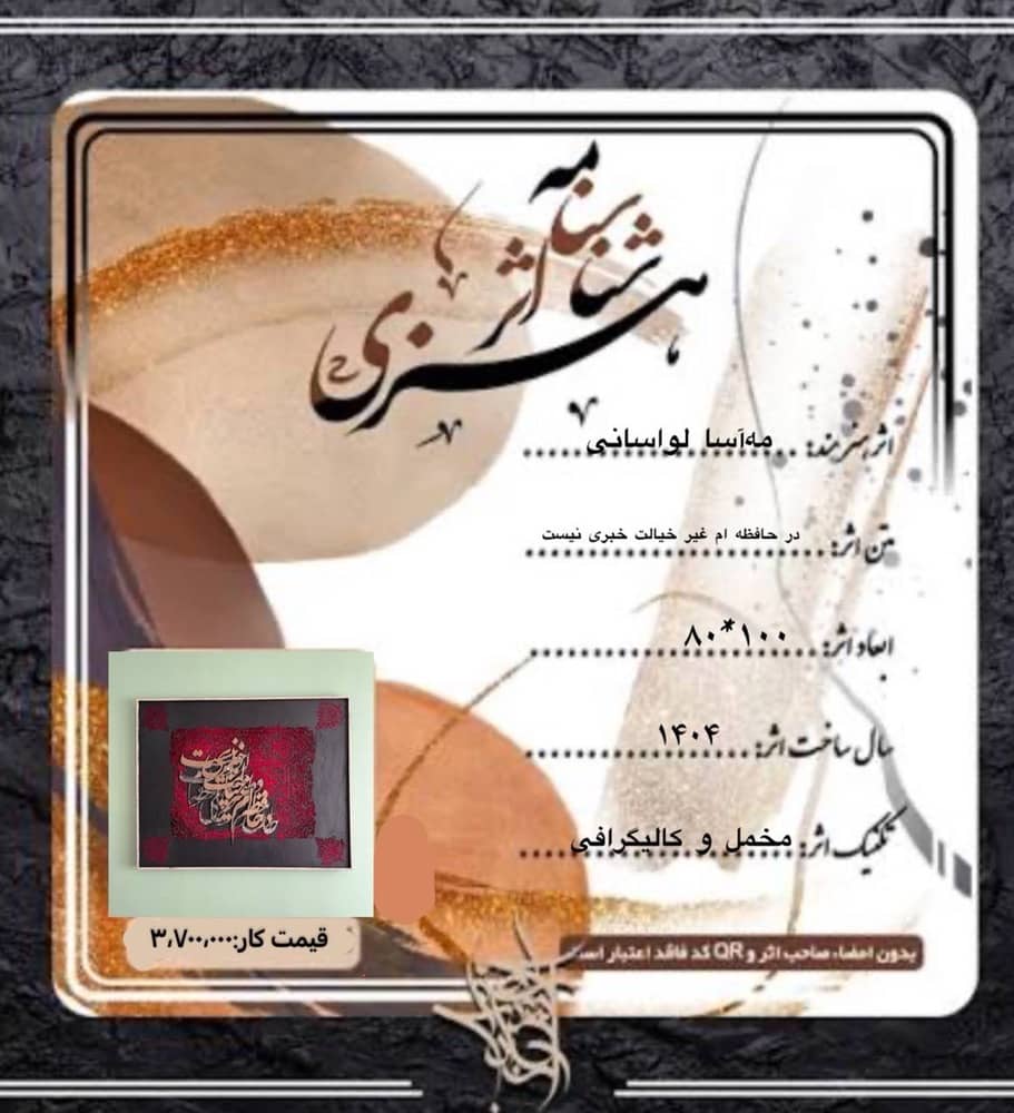 تابلو کالیگرافی ” در حافظه ام غیر خیالت خبری نیست”با تکنیک مخمل- ابعاد 80 در 100 سانتیمتر- اثر هنرجو مه آسا لواسانی